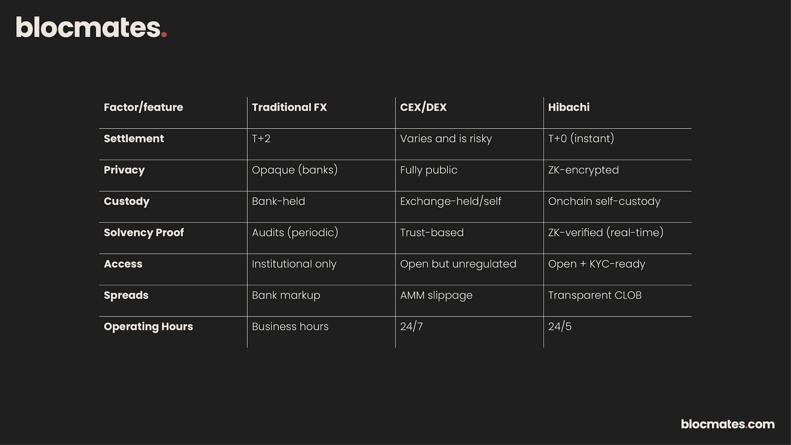 Hibachi’s FX exchange will support KYC and AML screening as required by institutional trading firms as a core design decision.