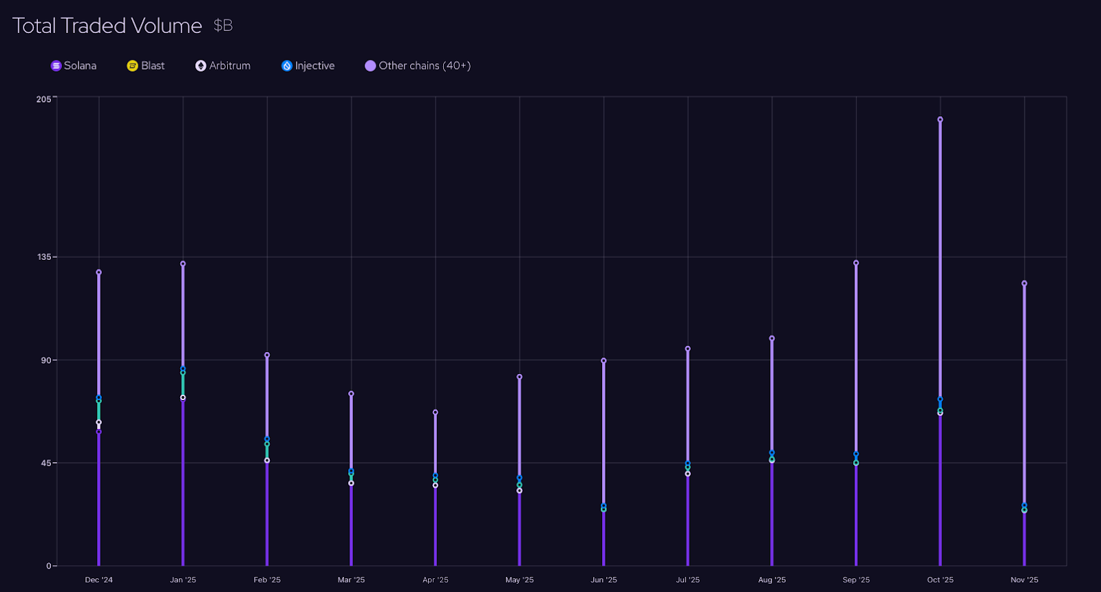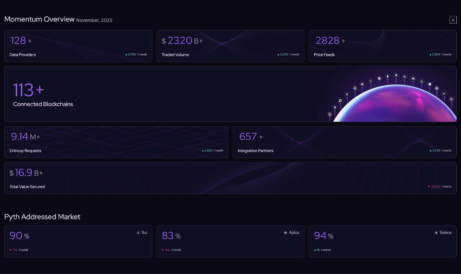In this context, 60% of derivatives protocols depend on Pyth Price Feeds, and in most months of 2025, the Total Trading Volume (TTV) surpassed $100 billion.