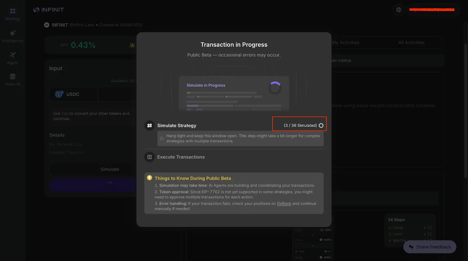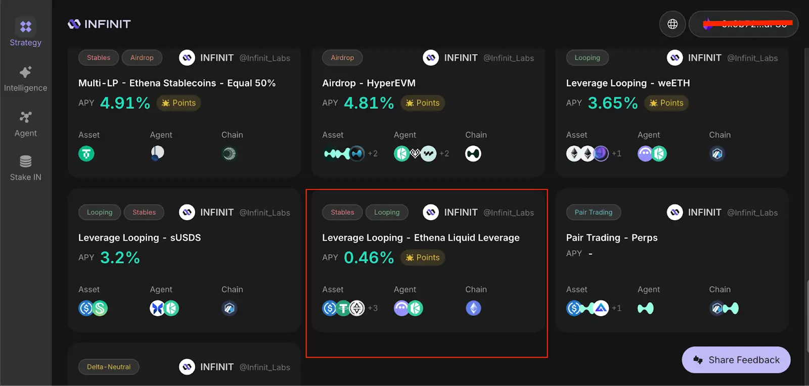 While users could retrieve personalized DeFi strategy insights, suggestions, and execute transactions with specialized agents through INFINIT Intelligence, INFINIT Strategies as a product enhances this ability by lumping complex yield strategies often involving multiple protocols and networks into one-click execution.