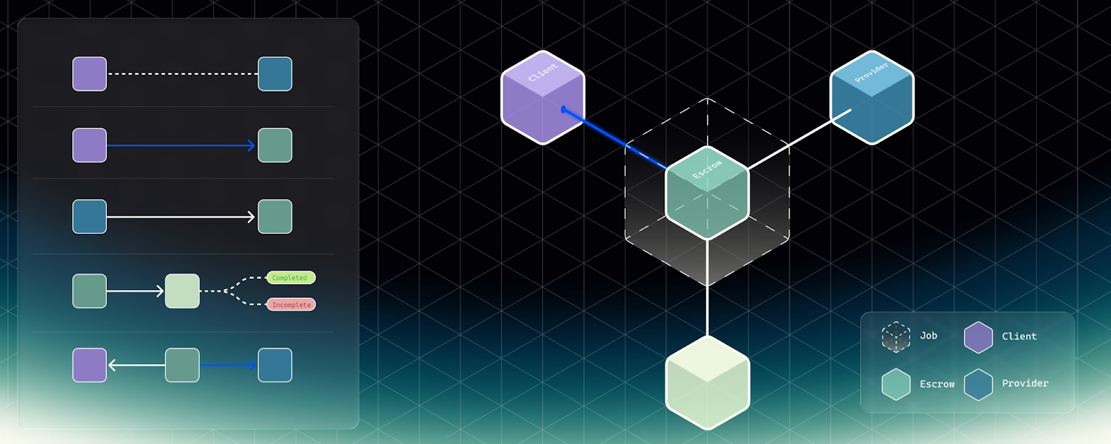 Each job consists of three parties: Client, Provider, and the Evaluator, with the escrow account sitting smack in the middle, safeguarding assets until the job spec is deemed worthy by the Evaluator.