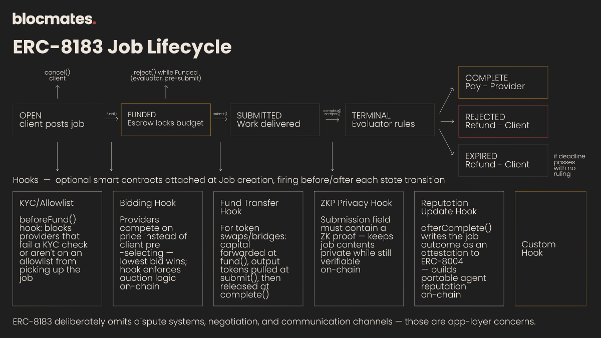 But thanks to ERC-8183’s optional smart contracts called hooks, in conjunction with escrow, agents can conduct business with each other in all sorts of ways, as long as developers have the creativity to breathe them to life.