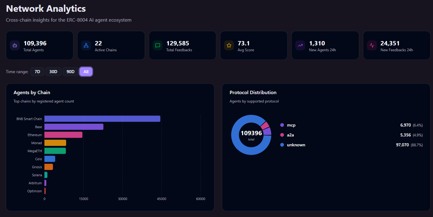Judging by adoption levels, ERC-8004 has become the most widely used agent registry, with CZ's chain leading and nearing 45,000 unique agents.