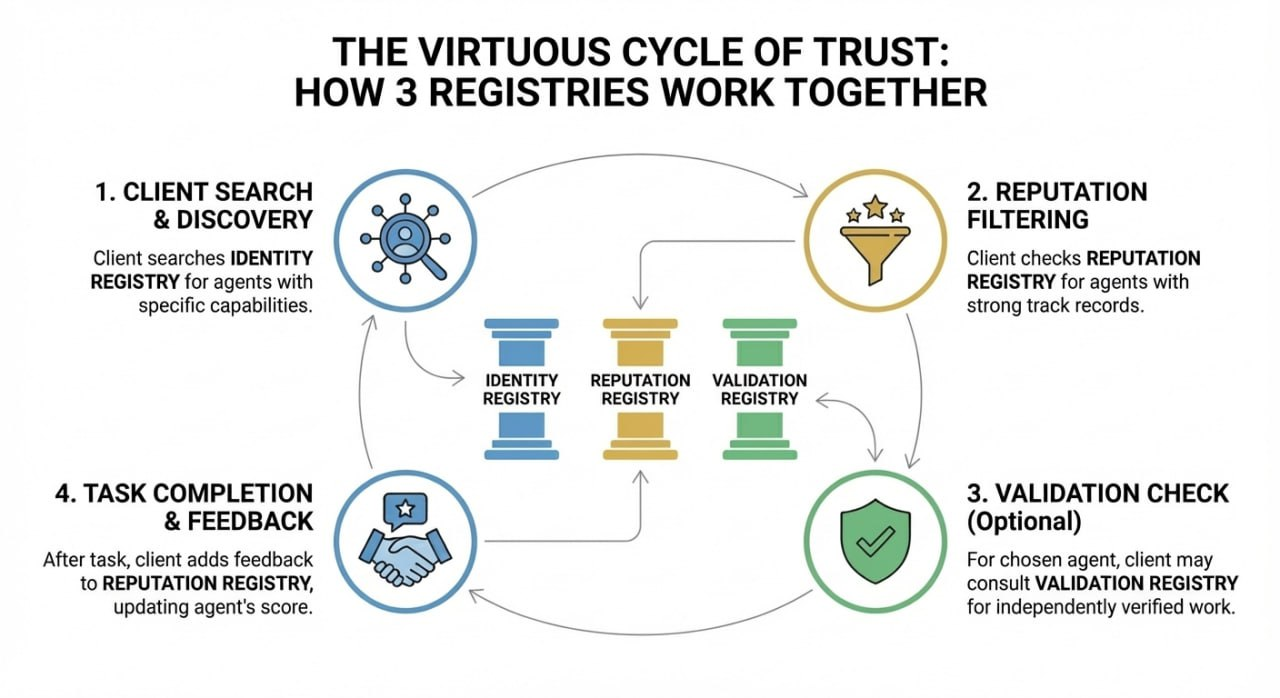 ERC-8004 turns agents from mere code into accountable economic actors capable of judging each other’s work, their reputation, and whether their spec meets the requirements of a specific job.