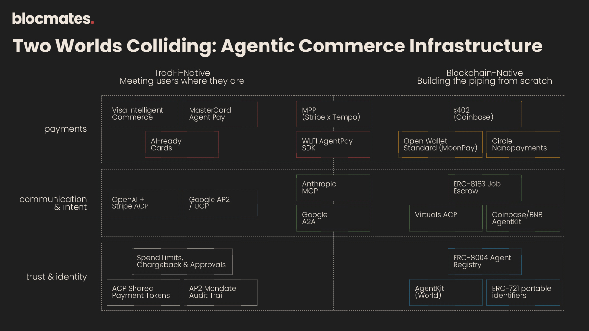 The reason we’re seeing such a broad design space for agent commerce infrastructure is mainly a clash between two fronts: those who innately understand that the most suitable layer for the agent economy is the blockchain, and those who’re meeting users where they’re currently at.