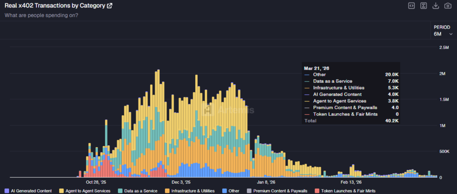 The more pressing problem, however, is that the total x402 volume across all chains is at its lowest levels since its inception, with true A2A transactions making up less than 20% of the total.