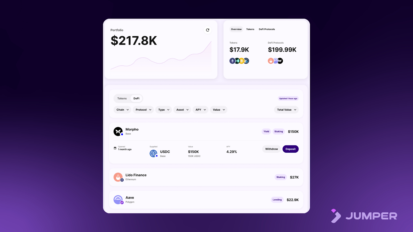 Moreso, unlike most portfolio trackers that only let users view their positions, Jumper Portfolio, combined with Jumper Earn, lets users act - they can withdraw and manage, and redeploy assets on Jumper Earn directly without leaving the interface.