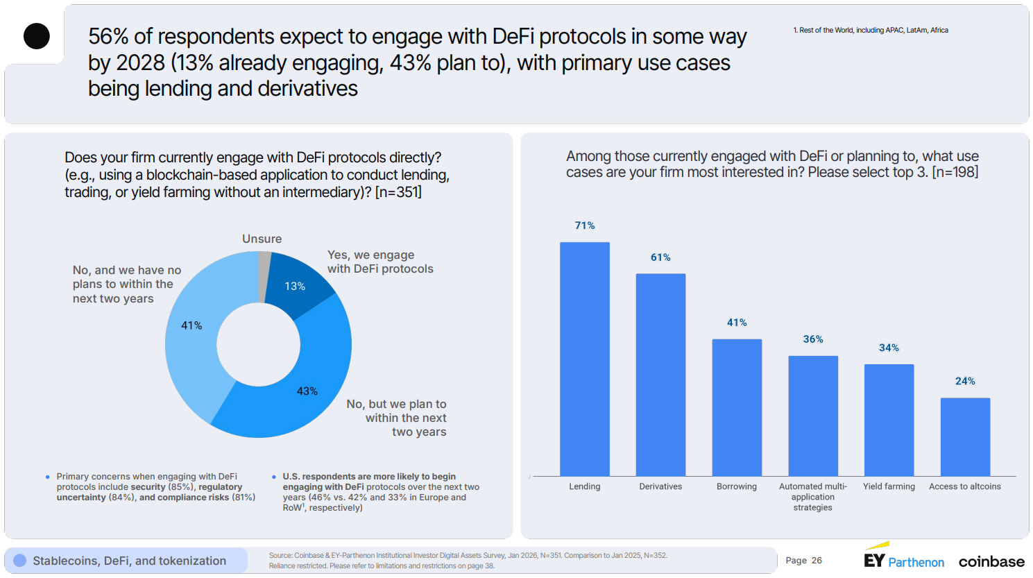 The annual EY-Parthenon and Coinbase Institutional Investor survey highlights that 73% of institutional decision-makers plan to increase allocation to digital assets in 2026, and 56% expect to engage with DeFi by 2028.