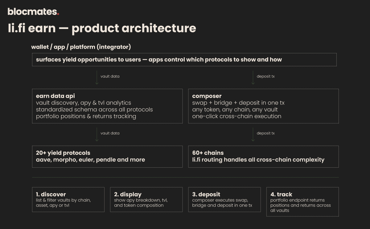 Under the surface, the product consists of two infrastructure primitives featured in LiFi’s stack: the Earn Data API, which normalizes all available vaults into structured metadata, fetches live APY and TVL, and can track user portfolios, alongside the Composer, which enables one-click deposits, cross-chain flows, and any-token-to-vault transactions.
