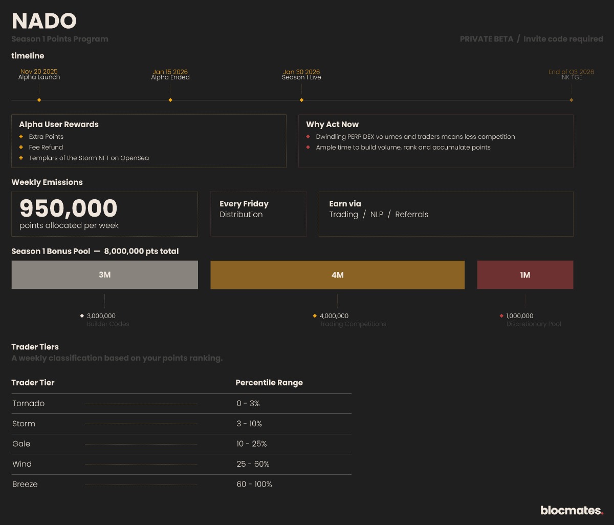 Nado kicked things off with a private alpha, which launched on November 20, 2025, and ended on January 15, 2026. After the private alpha concluded, users were given "the choice," where they could choose between extra points, a fee refund, or a “Templars of the Storm” NFT, now available on OpenSea.