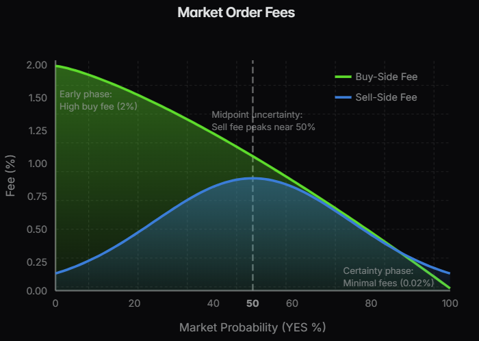 2. Sell fee - On the sell side, if a user waits until the market is resolved, they pay no fee; if a user places limit orders (making them a maker), there’s no fee. The only time a fee is paid is when a user wants to close their position early. In that case, the same uncertainty-based fee applies.