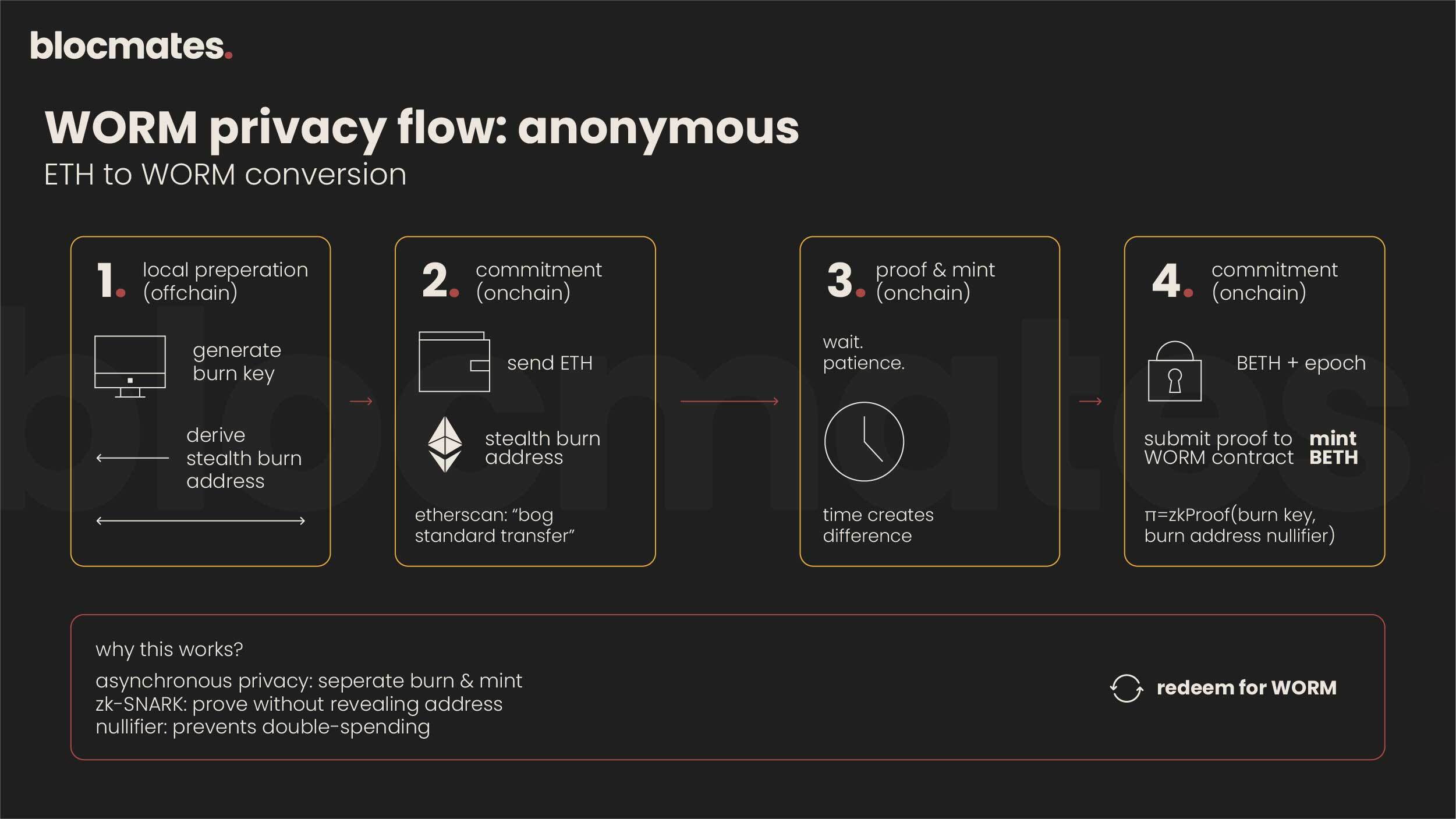 WORM is inspired by EIP-7503, a proposal for zero-knowledge Wormholes that introduces the concept of Private Proof-of-Burn (PPoB) to Ethereum.