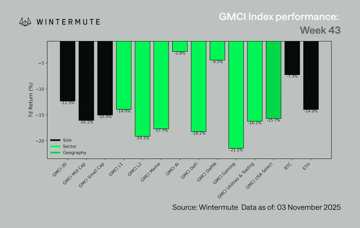 Wintermute’s weekly breakdown shows broad declines across sectors, with the GMCI-30 index down 12%, gaming down 21%, L2s down 19%, and meme tokens down 18%. Only AI and DePIN sectors showed relative stability.